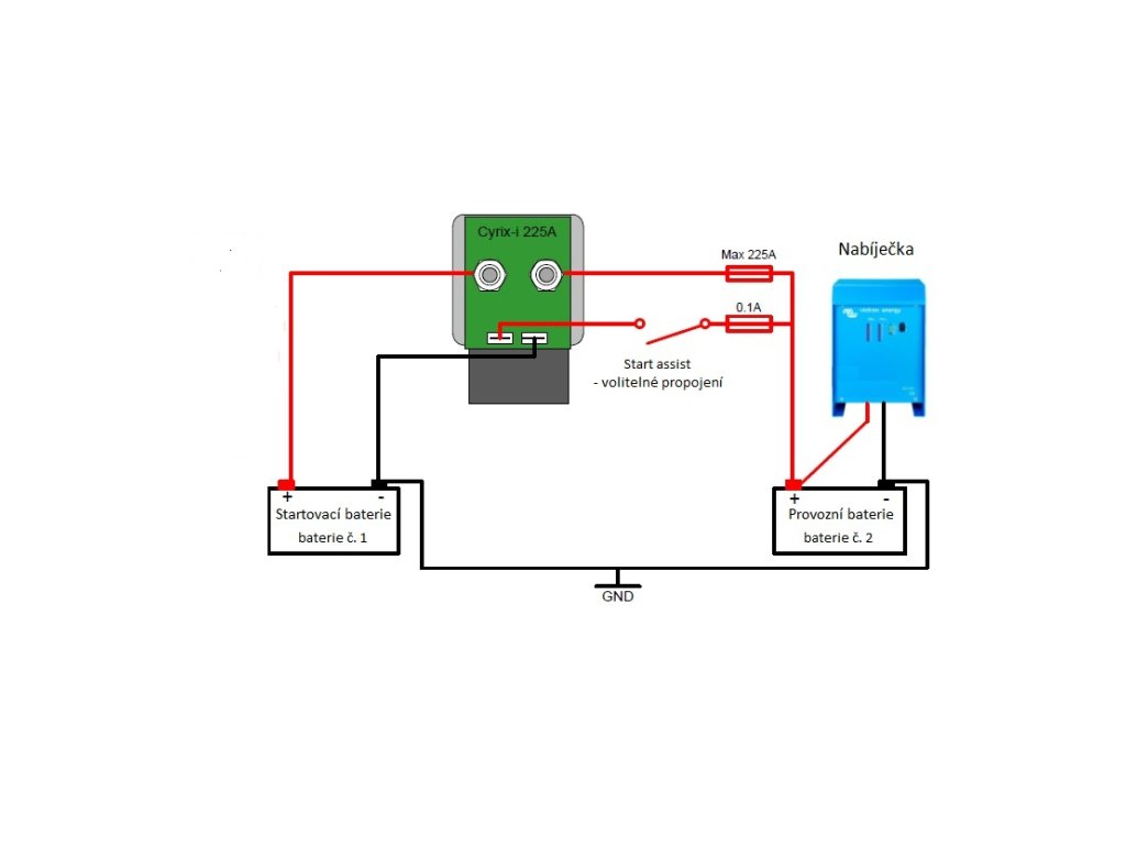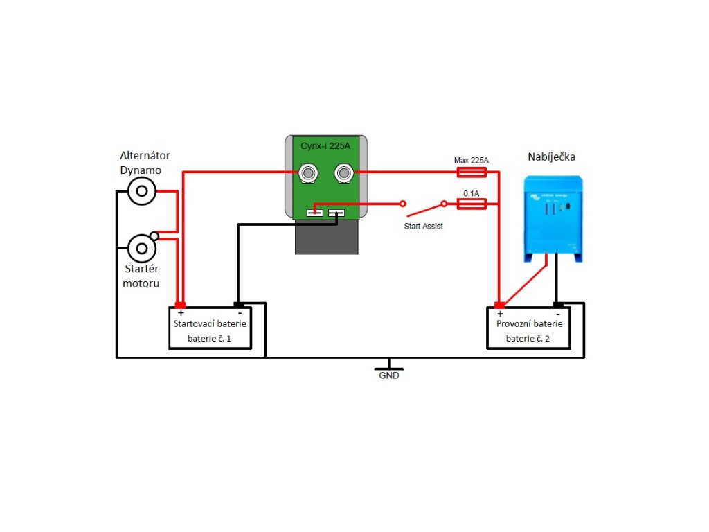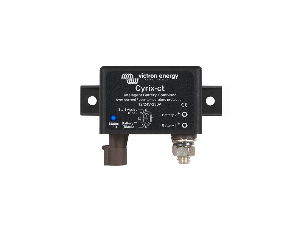 Inteligentní propojovač baterií Cyrix-ct řídí nabíjení a odpojování startovací a provozní baterie. Pokud je na jedné z baterií dosaženo napětí 13,0 V (26 V) po dobu 10 minut nebo 13,8 V (27,6 V) po dobu 4 sekund, Cyrix-ct baterie propojí a dochází k nabíjení obou baterií současně do plně nabitého stavu. Jakmile na jedné z baterií klesne napětí pod 12,8 V (25,6 V) po dobu 10 minut nebo 11,8 V (23,6 V) po dobu 4 sekund, dojde k vzájemnému odpojení baterií. Toto propojování a odpojování funguje obousměrně. Baterie mohou být odlišných kapacit, typů a konstrukcí. Předpokládá se, že každá baterie napájí své vlastní spotřebiče. Bližší popis zapojení viz dokumenty níže. Určeno pouze pro napětí 12 nebo 24 V.Doplňkové parametry