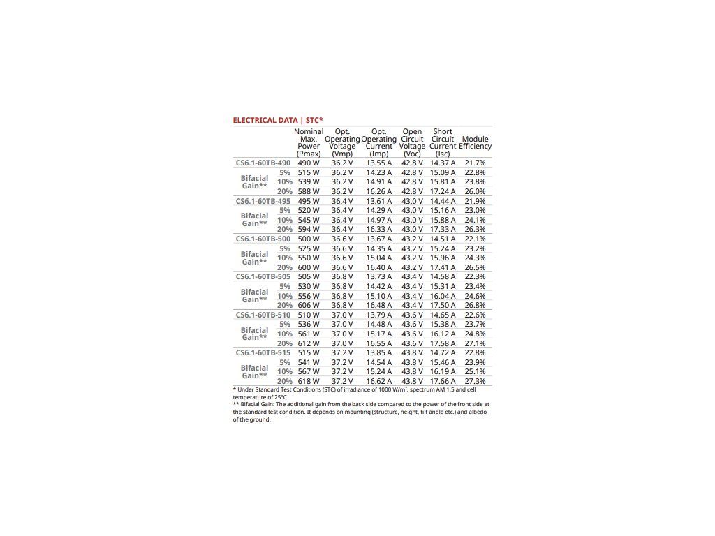 Bifaciální sklo/sklo panely CS6.1 využívají technologie N-type TOPCon. Díky bifacialitě dosahuje vyšších energetických zisků. Zisk ze zadní strany závisí na způsobu instalace a albedu země. Díky užitým technologiím má panely nižší LCOE a zajišťuje nižší náklady na systém.