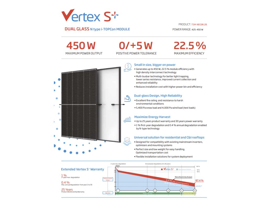 Univerzální panel. Tak jednoduše by se daly shrnout vlastnosti tohoto nového produktu od Triny. Výkon 450 W zaručuje mnohostranné využití na všechny typy menších a středně velkých instalací. Z hlediska použitých technologií se Trina nedrží zpátky a vstupuje do éry TOPCon článků s křemíkem typu N. To znamená jediné, maximální účinnost (22,5 %), minimální teplotní koeficient (-0,29%/C°) a odolnost vůči degradaci, kterou podtrhává 25letá záruka na zpracování produktu. Životnost panelu zaručuje provedení dual-glass, díky kterému je chráněn backsheet a snižuje se tak riziko porušení přírodními vlivy, jako je vznik mikrotrhlin a působení vlhkosti. Tento panel je navíc certifikovaný na požární odolnost třídy A+C a tím je vhodným kandidátem například na FV pro bytové domy.